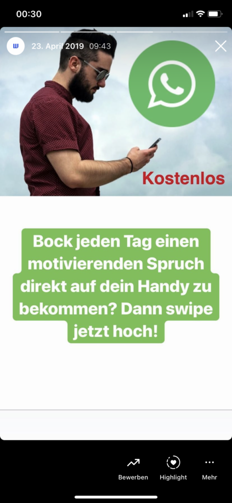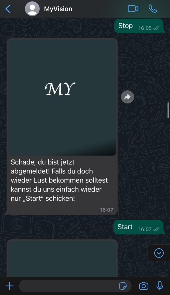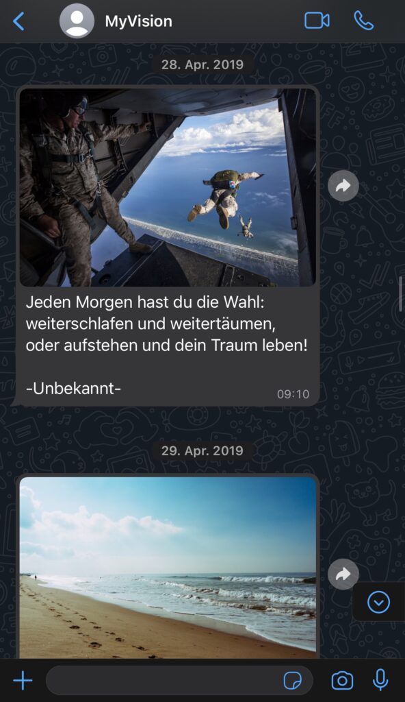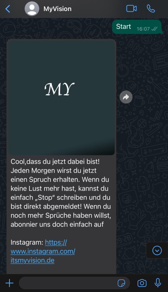 Unser WhatsApp Bot ermöglichte es den Nutzern, sich durch das Senden des Wortes ‚Start‘ an unsere WhatsApp-Nummer anzumelden. Nach der Anmeldung erhielten sie täglich automatisierte Sprüche, die sie motivierten und inspirierten. Diese wurden durch passende Bilder ergänzt, um die Botschaften visuell ansprechend zu präsentieren.