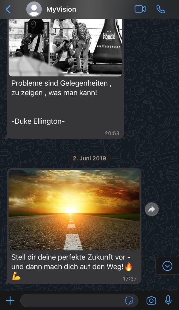 Im Jahr 2019, wir 15 Jahre alt, haben mein Bruder und ich gemeinsam das aufregende Projekt itsmyvision.de ins Leben gerufen. Unser Ziel war es, einen innovativen WhatsApp-Bot zu entwickeln, der unseren Nutzern täglich inspirierende Sprüche mit passenden Bildern liefert.